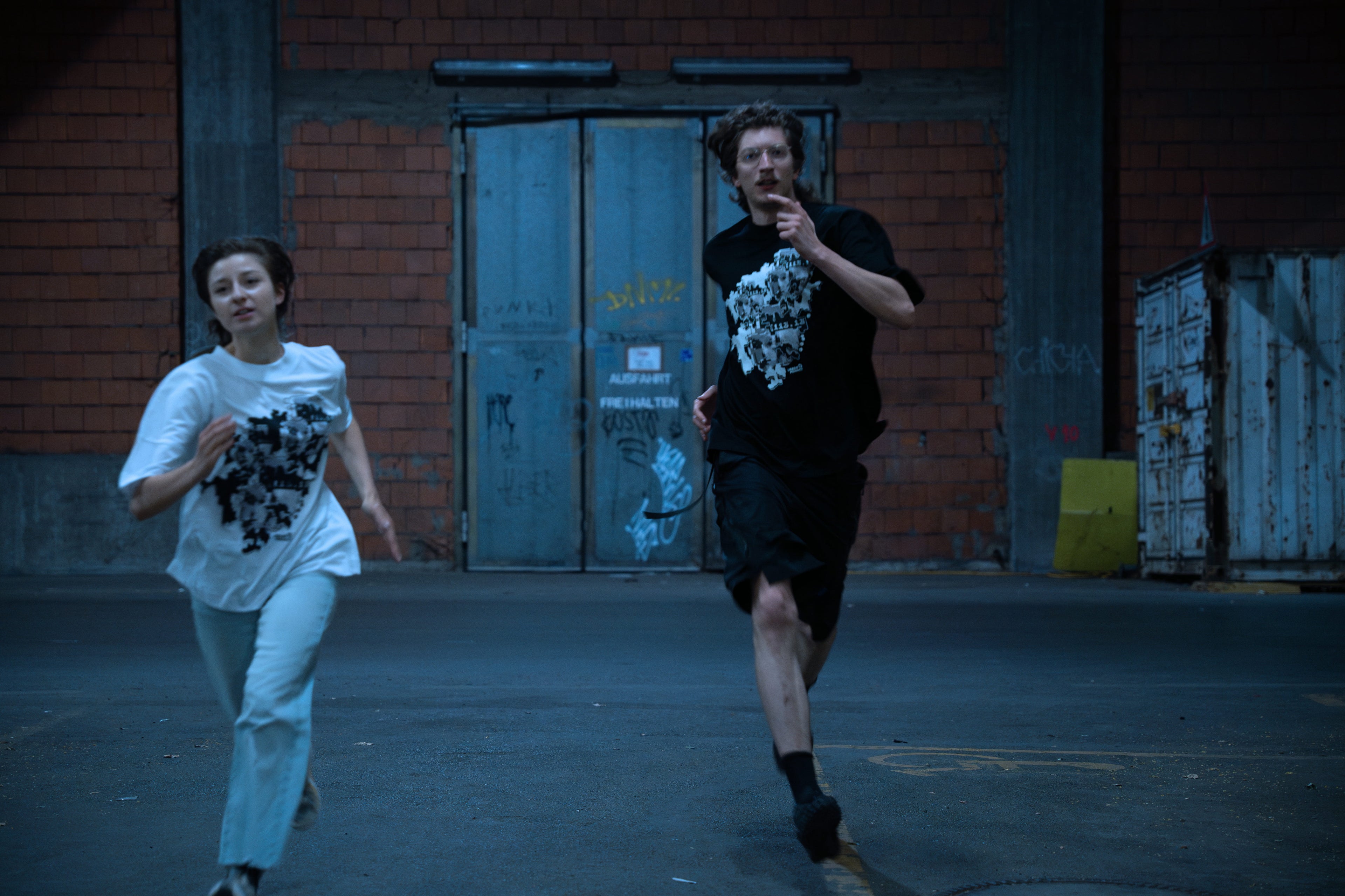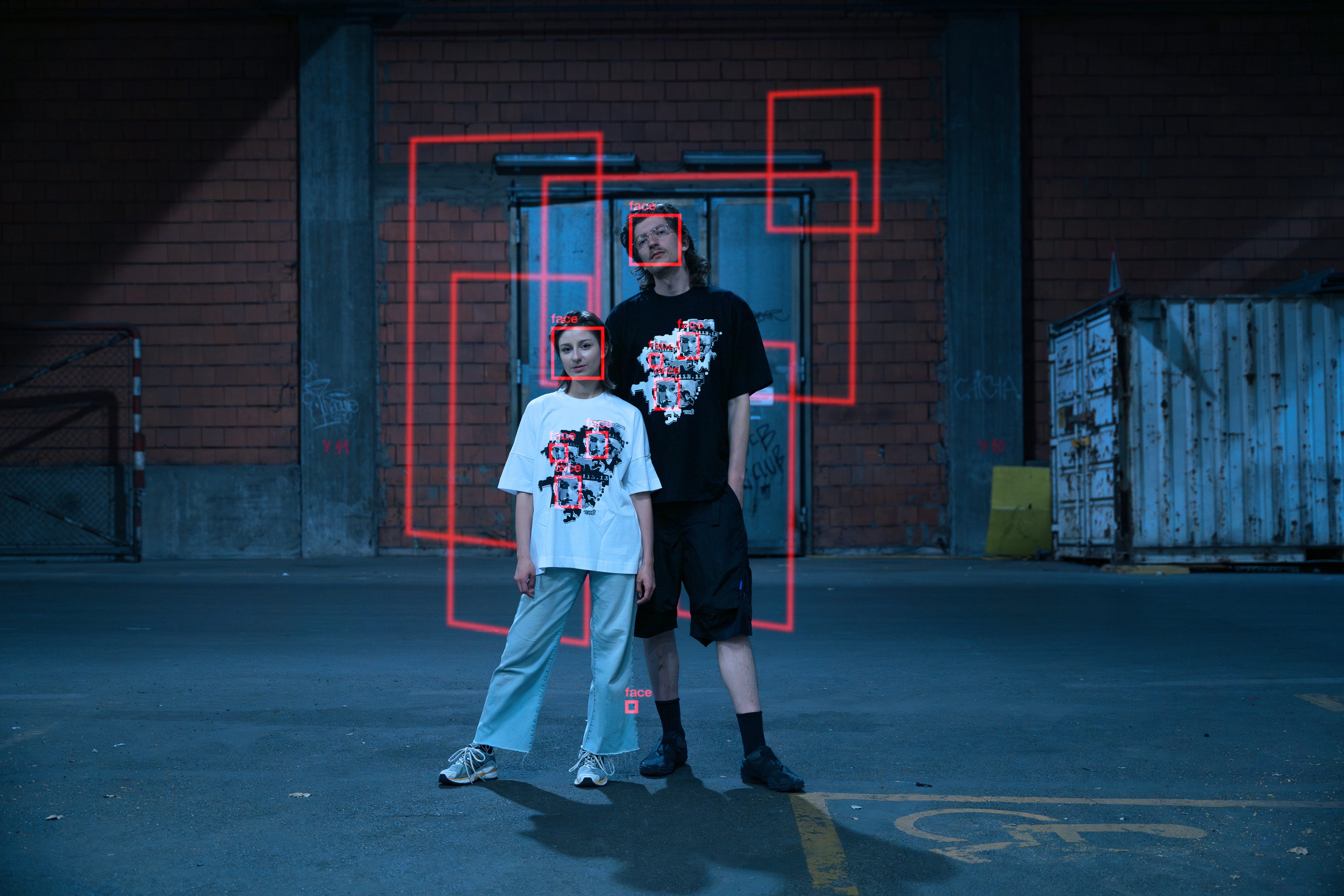 Lea Karnutsch and Ferdinand Doblhammer from flip the coin are wearing Faception. The pattern confuses face recognition AIs — detecting faces where there are none.