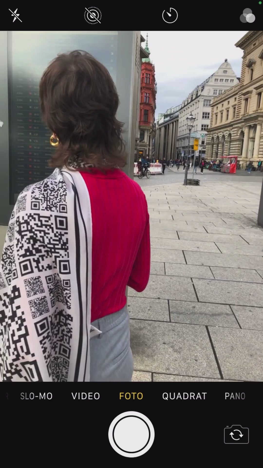 Wenn Du mit unserem QR-Code Schal abgelichtet wirst, erscheint die Nachricht "Stop taking pictures of me" auf dem Handy Display.