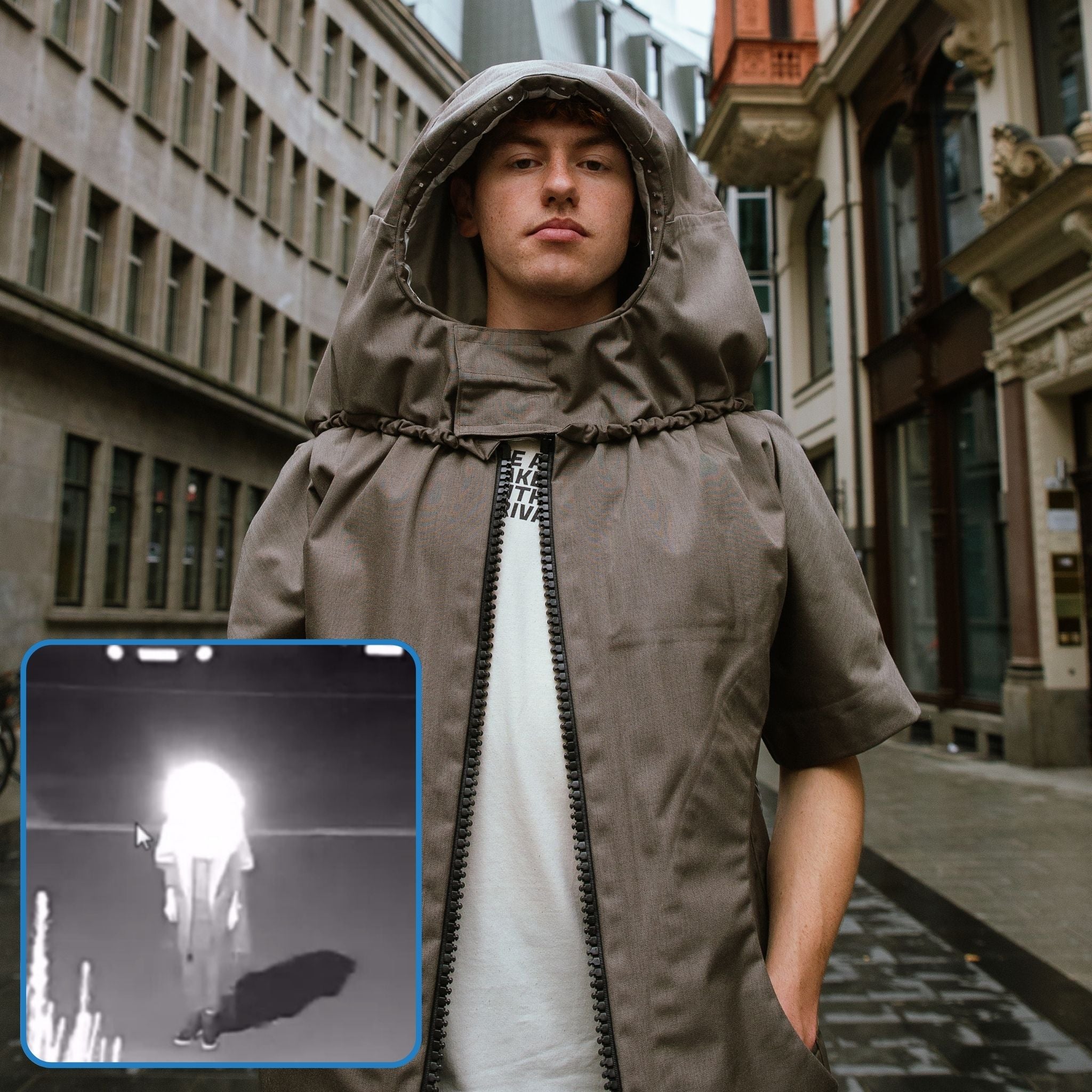 Nachtsichtkameras? Kein Problem. Der URBAN GHOST Mantel nutzt integrierte LEDs in der Kapuze, die Infrarotlicht abgeben und Überwachungssysteme blenden – aber nich für deine Augen. Für alle, die auch nach Sonnenuntergang nicht auf Privatsphäre verzichten. Futuristisches Design als neue Form der Rebellion.